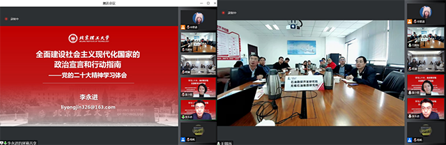 为深入学习领会党的二十大精神,全面落实2022年北京高校红色“1+1”活动的目标要求,10月28日下午,马克思主义学院2021级硕士研究生党支部与中国石化石油勘探开发研究院无锡石油地质研究所盆地与资源评价研究中心党支部开展“学习二十大,奋进新征程”为主题的共建活动。活动以线上+线下相结合方式进行,马克思主义学院院长助理、长聘副教授李永进、马克思主义学院讲师、党建研究中心研究员莫小丽,石勘院无锡石油地质研究所党群工作部主任王再锋、石勘院盆地与资源评价研究中心党支部书记周卓明,以及石勘院无锡石油地质研究所盆地党支部和马克思主义学院2021级硕士研究生党支部全体党员参加了此次活动。活动由周卓明书记和莫小丽老师共同主持。